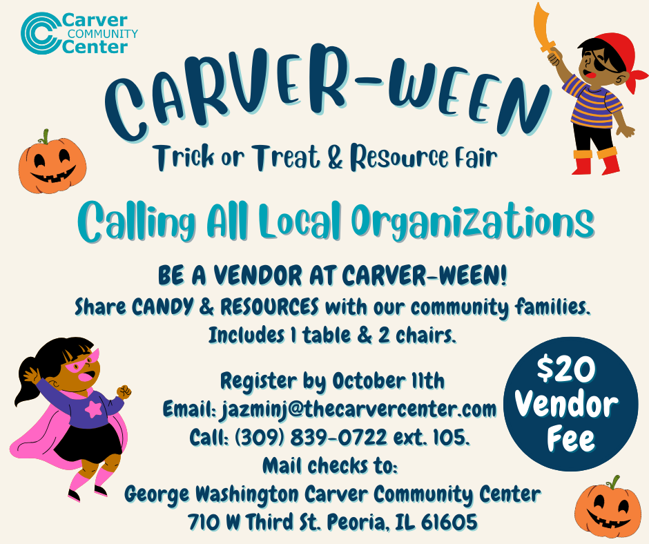 Join us for a fun afternoon of face painting, free candy, games, and family fun at our annual Carver-Ween! There will be treats, music, and plenty of good vibes—perfect for the whole family!